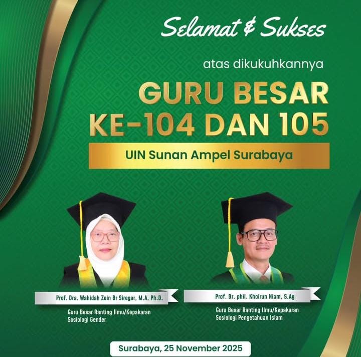 Surabaya, 25/112025 Tepat pada Hari Guru Nasional, UIN Sunan Ampel Surabaya (UINSA) kembali menggelar sidang senat terbuka dalam rangka pengukuhan guru besar ke-104 dan 105 yang diselenggarakan di Gedung KH. Syaifuddin Zuhri Sport Centre and Multipurpose Kampus UINSA A. Yani Surabaya. Pada pengukuhan guru besar kali ini, Fakultas Ilmu Sosial dan Ilmu Politik patut berbangga sebab rektor UIN Sunan Ampel Surabaya Prof. Akh. Muzakki, M.Ag., Grad.Dip.SEA., M.Phil., Ph.D., resmi mengukuhkan dua orang guru besar yang merupakan dosen aktif di FISIP UINSA. Keduanya merupakan akademisi yang berkonsentrasi pada kajian sosiologi yakni Prof. Dra. Wahidah Zein Br. Siregar, MA. PHD yang berfokus pada ranting ilmu/kepakaran sosiologi gender dan Prof. Dr. Phil Khoirun Ni’am dalam bidang sosiologi pengetahuan Islam sekaligus dekan Fakultas Psikologi dan Kesehatan (FPK). Sidang senat terbuka dalam rangka pengukuhan guru besar ini merupakan bentuk penghargaan atas dedikasi, pengabdian dan integritas keduanya dalam pengembangan ilmu pengetahuan.